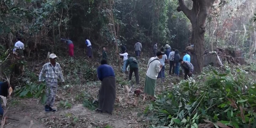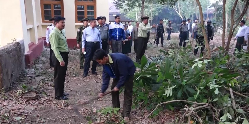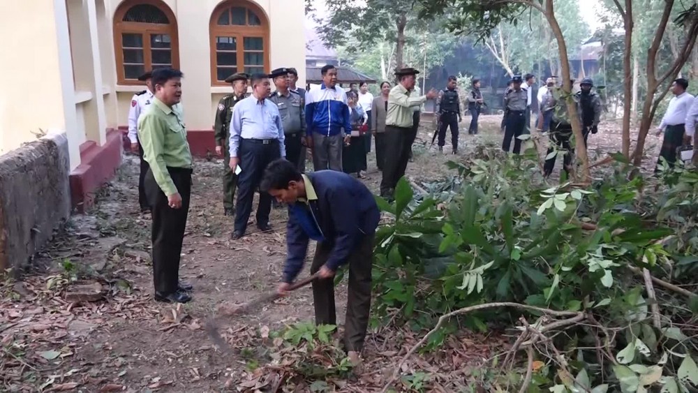 Mon State Chief Minister U Aung Kyi Thein accompanied by the State Government Ministers oversaw the clearance of bushes and garbage at No. (3) Basic Education High School campus of Mawlamyine Township on Saturday, collectively conducted by departmental personnel, Members of Myanmar Police Force and Fire Brigade, social organizations and locals.