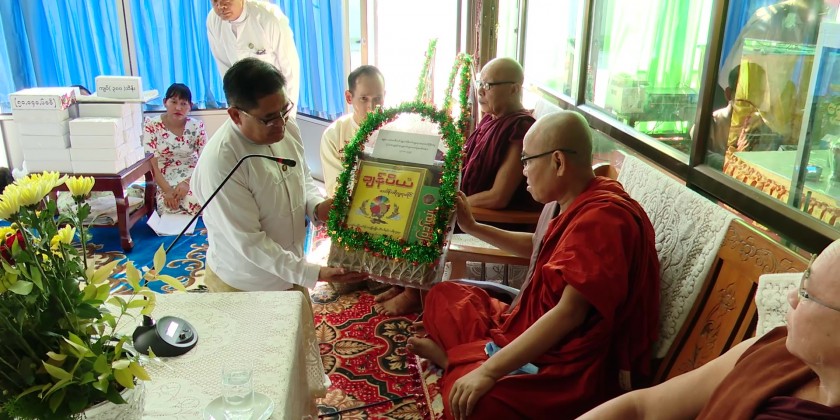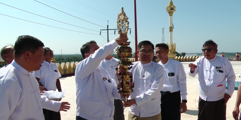 Then, Chief Minister U Khet Htein Nan participated in a ceremony where he received admonishment from the Sayadaw for presenting gold foils to the Wish Granting Shwe Moe Taung Pagoda in Mong Nar Village-tract, Waimaw Township.