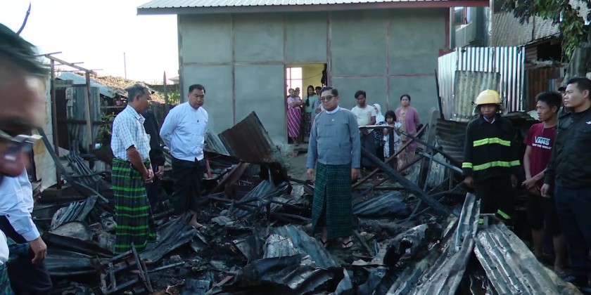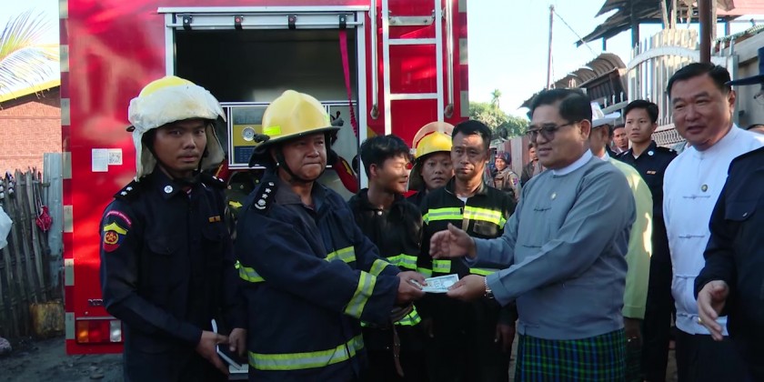 Afterwards, the Chief Minister and party viewed around fire-affected area in Rampu Ward and the Chief Minister encouraged the affected people. And, the Chief Minister and party provided 1 million kyats cash assistance to 4 fire-affected households and 200,000 kyats to fire brigade members and coordinated the requirements on rehabilitation processes. They then inspected the commemoration signboard of 76th Anniversary Independence Day and Welcome to Myitkyina near Aung Zay Yan Aung Pagoda, flower plantation in May Kha Garden and implementation of recreation place for public.
