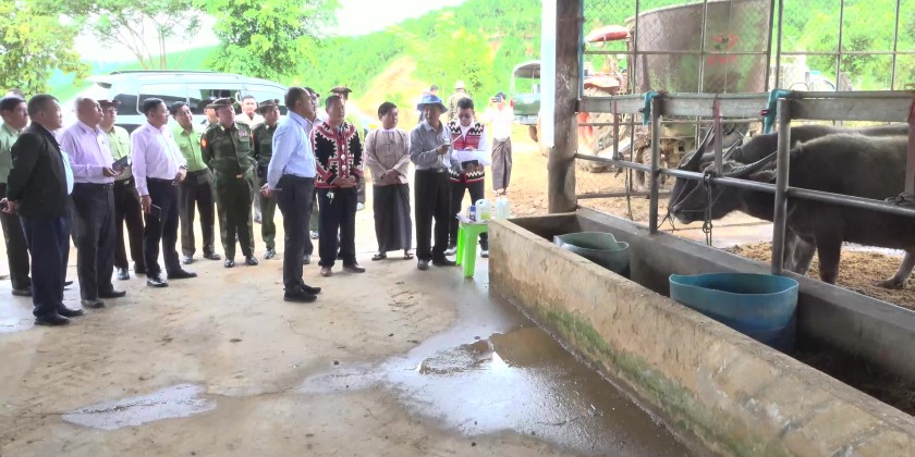 Then, the Chief Minister and party visited the 300 acre orange farm and livestock breeding farm of PhyuntPhyuPyawShwin Co., Ltd in Nar Yaung Village of Tarlay and provided leaf booster and nutrients for cattle.