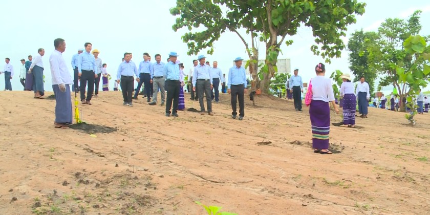 Union Minister U Min Naung and officials planted teak and Acacia mangium trees at the designated places and observed the staff who were planting trees.