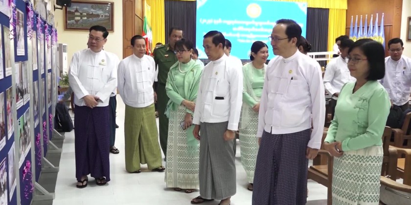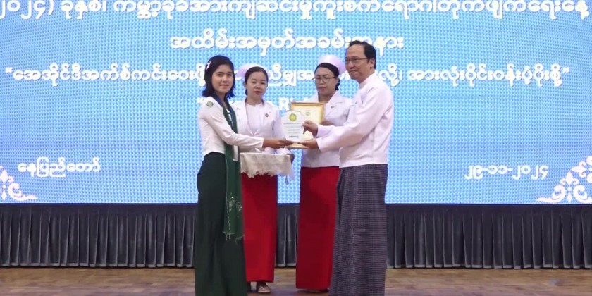The ceremony then continued with the prize presentation to the winners of the essay, painting and poster competitions for World AIDS Day. After a video on Myanmar's HIV/AIDS efforts on prevention, the Union Minister and attendees toured the commemoration booth.