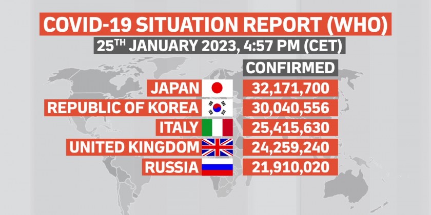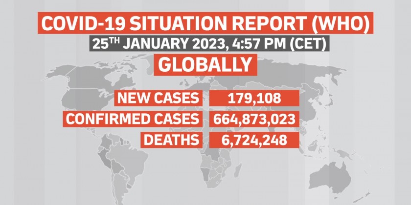 Globally, as of 4:57 pm CET, 25 January 2023, there have been over 664 million confirmed cases of COVID-19, including over 6.7 million deaths.