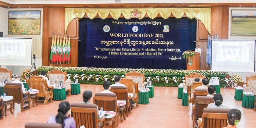 The Ministry of Agriculture, Livestock and Irrigation held a ceremony to celebrate the World Food Day 2021 Saturday morning. The ceremony was attended by Union Ministers, Chairman of the Nay Pyi Taw Council, Deputy Minister and officials, Diplomats, president of (UMFCCI) and its affiliated associations, Representatives from the Central Cooperative Society Limited, agricultural production and trade cooperatives, agricultural associations, and farmers joined the ceremony virtually.