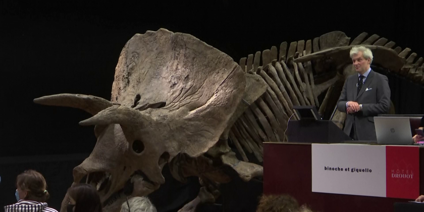 The world’s biggest triceratops skeleton, known as “Big John,” was sold for 6.6 million euros on Thursday at a Paris auction house.