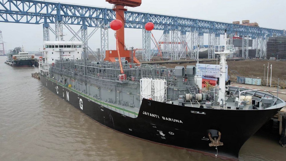 The world's first compressed natural gas (CNG) carrier was delivered on Saturday in Qidong, China, before setting sail for Indonesia.