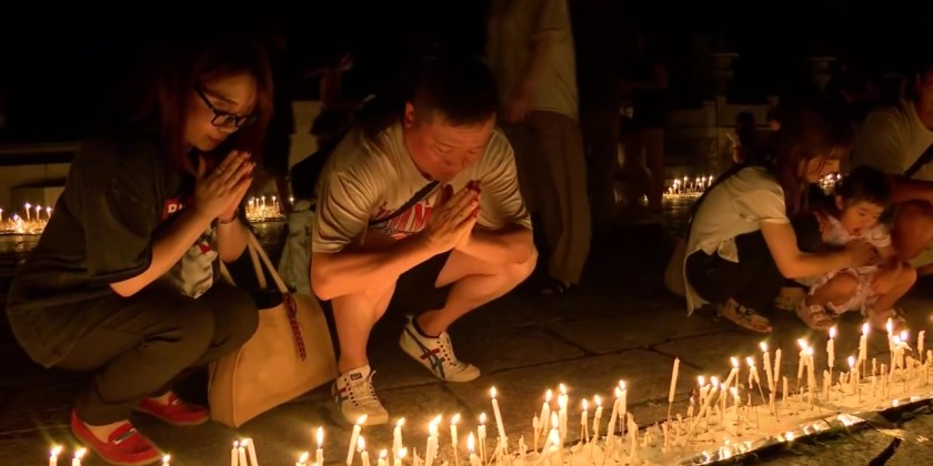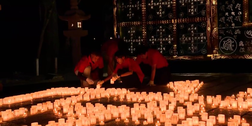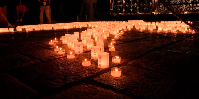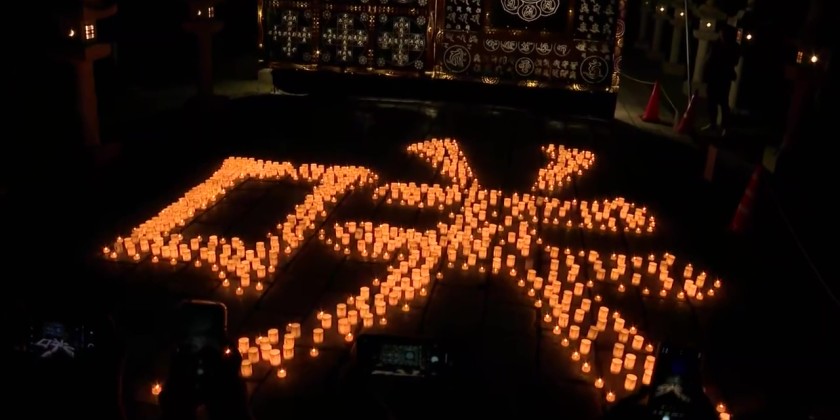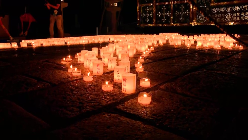 Numerous small lanterns bearing wishes written by worshipers were also placed on the path in a shape of a Chinese character meaning "bloom." The character was chosen to stand for the wish that a flower for everyone's happiness will bloom.