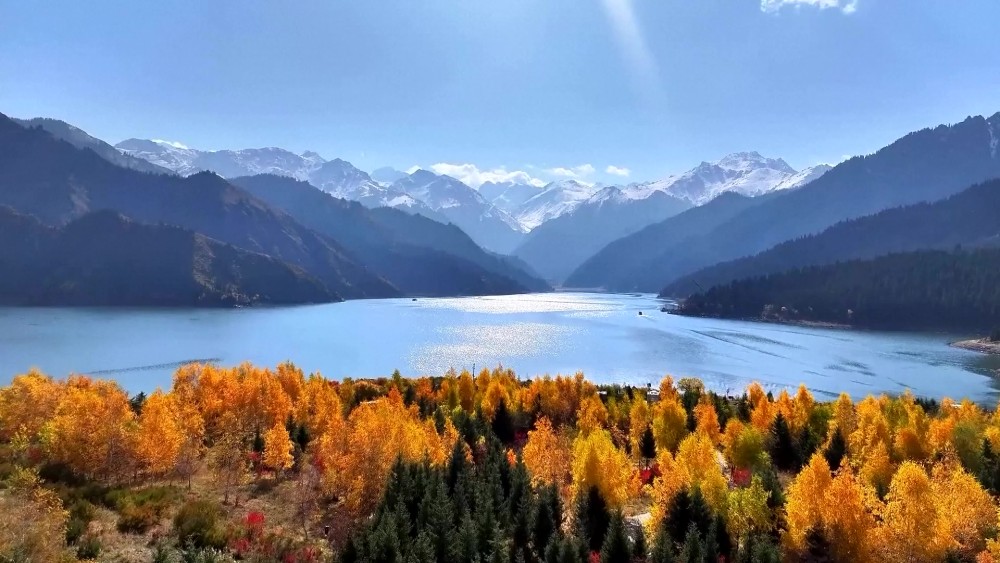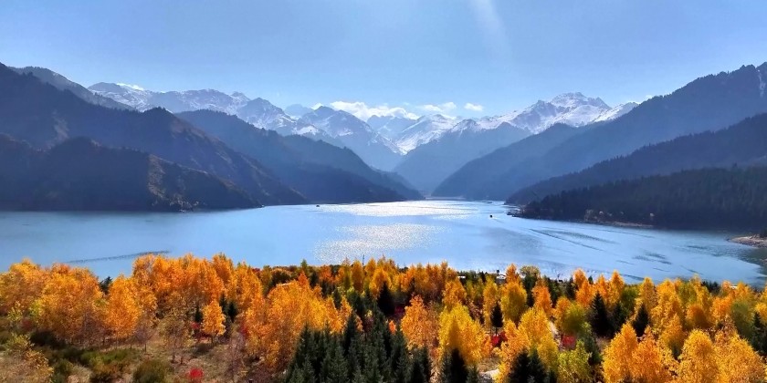 In Xinjiang, autumn has transformed the Tianshan Mountains into a picturesque destination. At the Nalati Scenic Area, early snowfall accents golden forests, while along the Tarim River, populus euphratica forests have reached their peak viewing season.