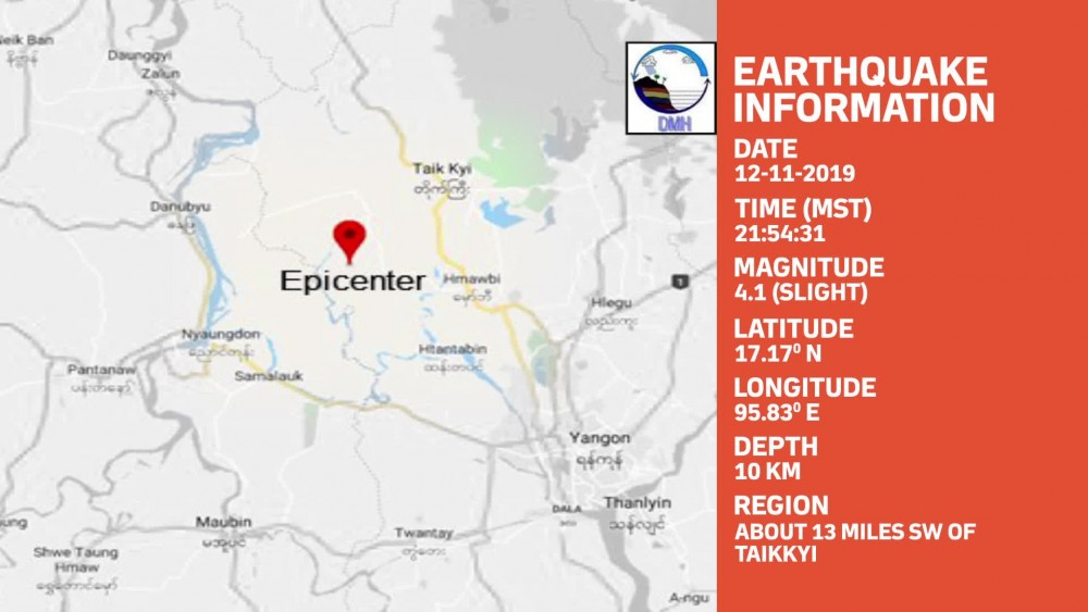 A slight earthquake of magnitude (4.1) Richter Scale with its epicenter inside Myanmar (about (13) miles southwest of Taikkyi), latitude 17.17°N, longitude 95.83°E, depth (10) kilometers, about (30) miles northwest of Kaba-Aye seismological observatory was recorded at (21)hr (54)min (31)sec Myanmar Standard Time on 12th November, 2019.