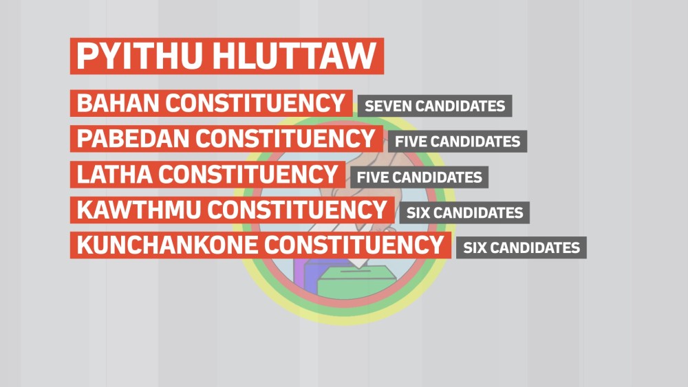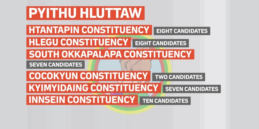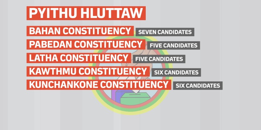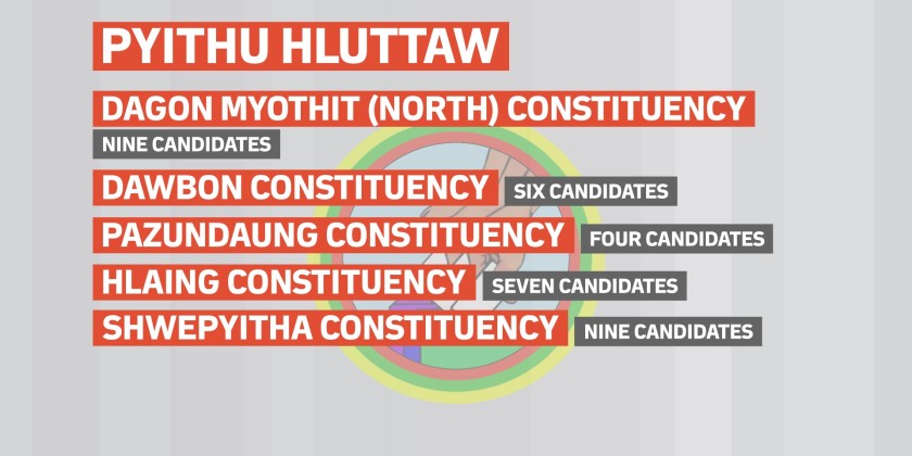 For Pyithu Hluttaw seats, seven candidates are contesting in Bahan Constituency; five candidates in Pabedan Constituency; five candidates in Latha Constituency; six candidates in Kawthmu Constituency; six candidates in Kunchankone Constituency; nine candidates in Dagon Myothit (North) Constituency; six candidates in Dawbon Constituency; four candidates in Pazundaung Constituency; seven candidates in Hlaing Constituency; nine candidates in Shwepyitha Constituency; eight candidates in Htantapin Constituency; eight candidates in Hlegu Constituency; seven candidates in South Okkalapa Costituency; two candidates in Cocokyun Constituency; seven candidates in Kyimyindaing Constituency; and ten candidates in Innsein Constituency.