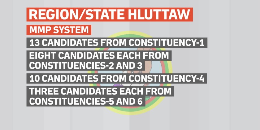 For the Region Hluttaw, one candidate will be elected from each constituency under the First-Past-the-Post system. Under the Mixed-Member Proportional system, 13 candidates will be elected from Constituency Number One, eight candidates each from Constituencies Numbers Two and Three, 10 candidates from Constituency Number Four, and three candidates each from Constituencies Numbers Five and Six.