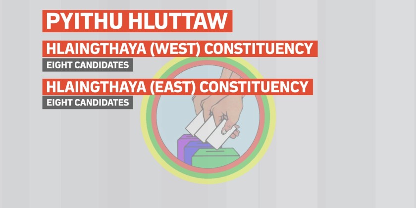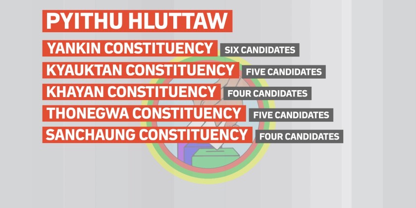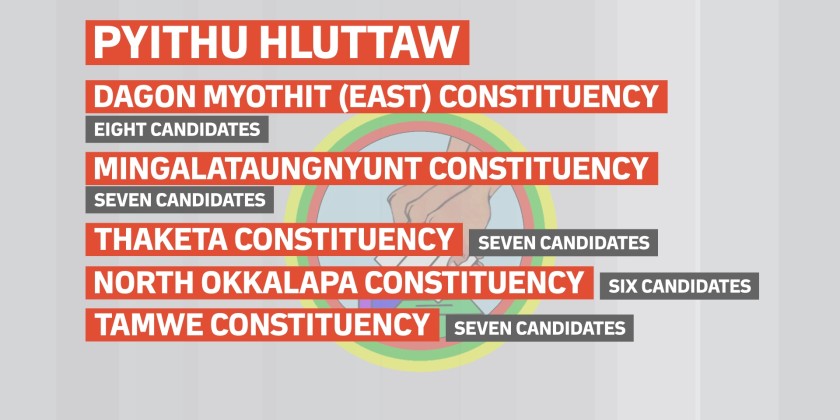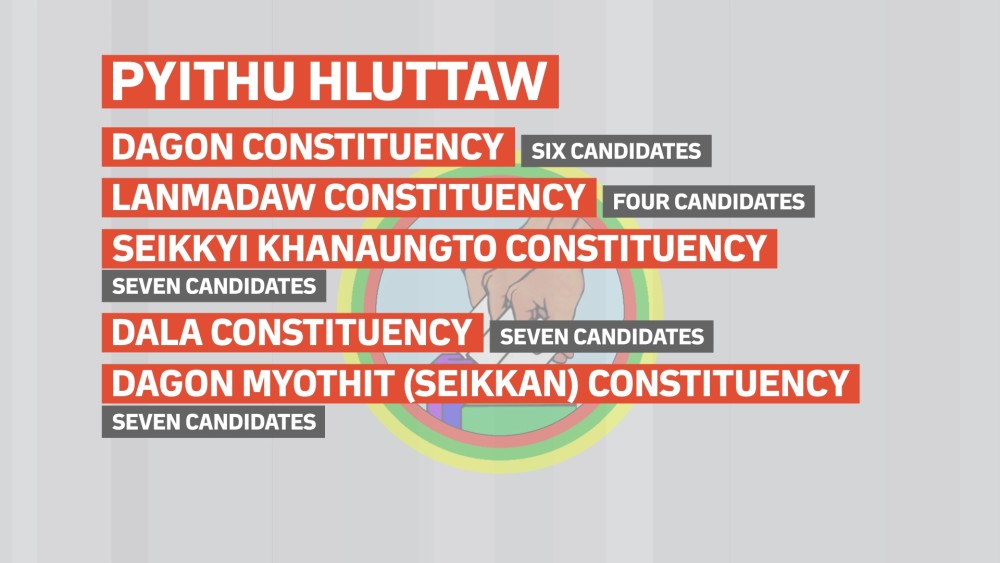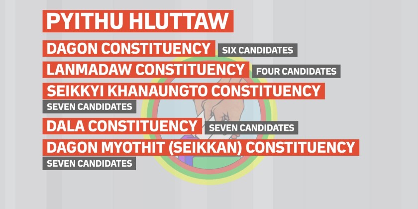 For Pyithu Hluttaw seats, six candidates are contesting in Dagon Constituency; four candidates in Lanmadaw Constituency; seven candidates in Seikkyi Khanaungto Constituency; seven candidates in Dala Constituency; seven candidates in Dagon Myothit (Seikkan) Constituency; eight candidates in Dagon Myothit (East) Constituency; seven candidates in Mingalataungnyunt Constituency; seven candidates in Thaketa Constituency; six candidates in North Okkalapa Constituency; seven candidates in Tamwe Constituency; six candidates in Yankin Constituency; five candidates in Kyauktan Constituency; four candidates in Khayan Constituency; five candidates in Thonegwa Constituency; four candidates in Sanchaung Constituency; eight candidates in Hlaingthaya (West) Constituency and eight candidates in Hlaingthaya (East) Constituency.
