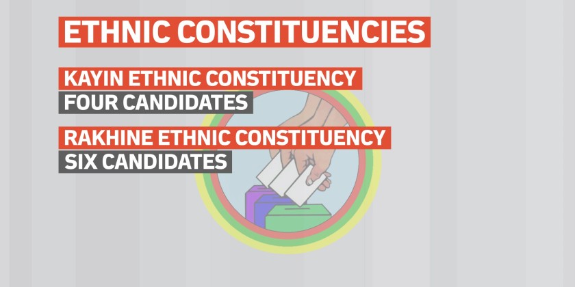 For Ethnic Affairs Minister seats, four candidates from four political parties are contesting in the Kayin Ethnic Constituency, while six candidates from five political parties and one independent candidate are contesting in the Rakhine Ethnic Constituency.