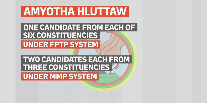 For Amyotha Hluttaw, under the First-Past-the-Post system, one candidate will be elected from each of six constituencies, while under the Mixed-Member Proportional system, two candidates each will be elected from three constituencies.