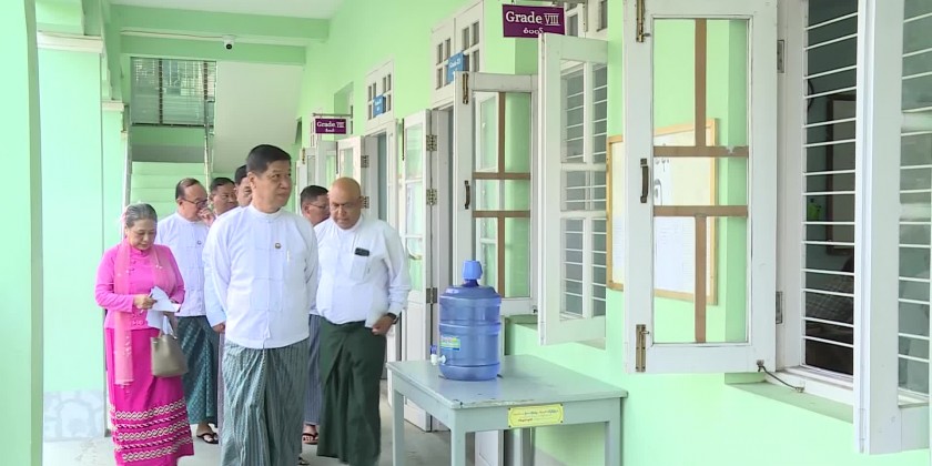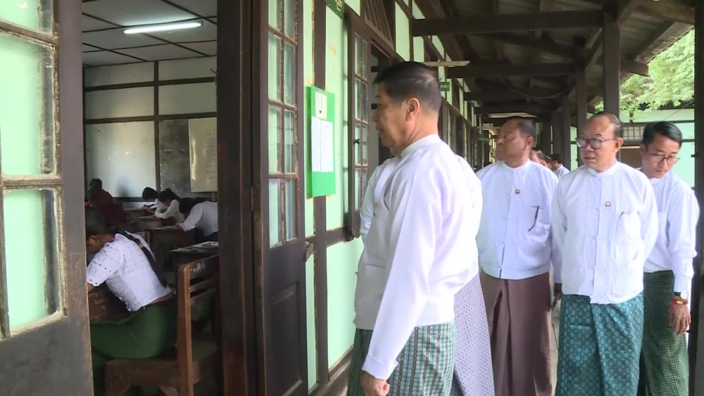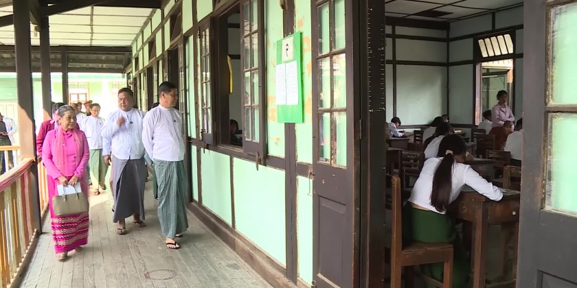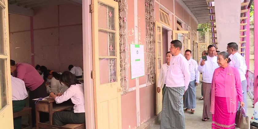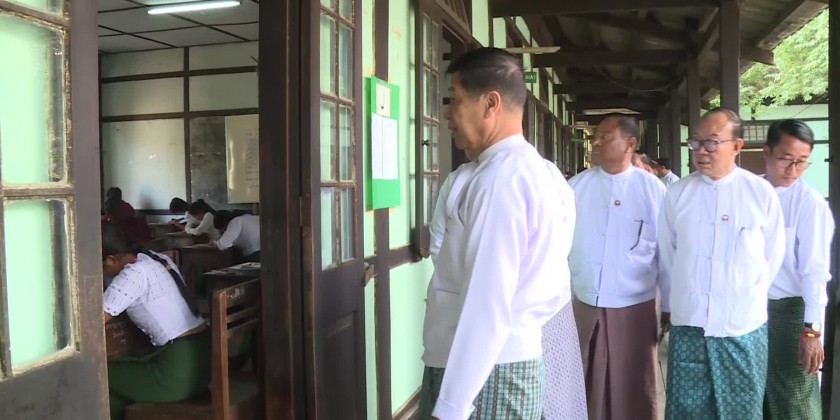 Chief Minister U Myo Aung, along with officials, visited the exam centers of basic education schools in Aung MyayThazan and Maha Aung Myay Districts to observe Grade-5 and Grade-9 students taking their year-end examinations.