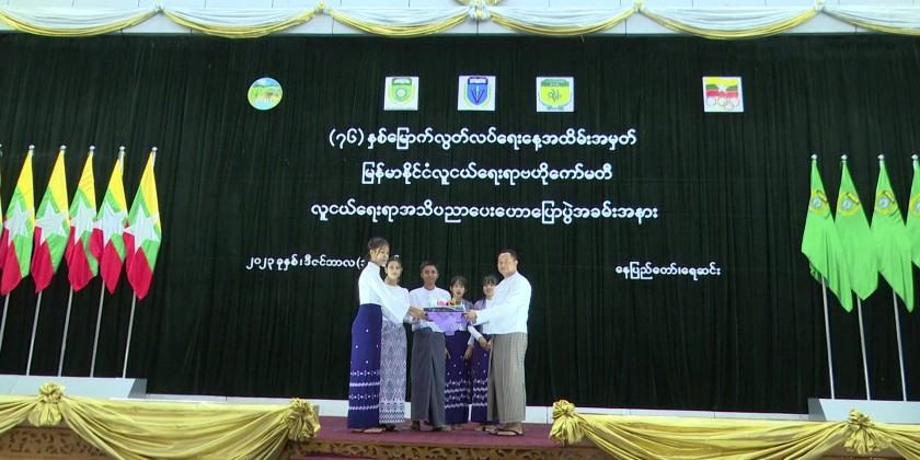 Then, the Deputy Ministers presented sports equipment and honorary gifts to the students from the Agriculture University, University of Veterinary Science, and the Agriculture Institute (Pyinmana), and the Rector of Agriculture University expressed words of thanks.