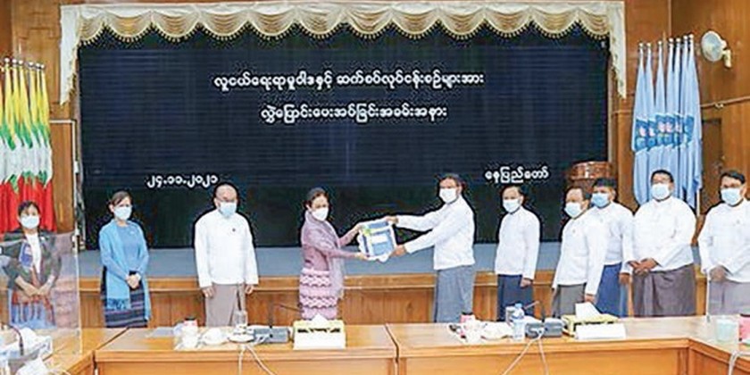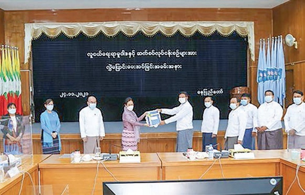 The handing over Youth Affairs Policy and related work processes to the Ministry of Sports and Youth Affairs with a ceremony was held at the Ministry of Social Welfare, Relief and Resettlement in the morning on Wednesday and the Union Minister for Sports and Youth Affairs U Min Thein Zan, Union Minister for Social Welfare, Relief and Resettlement Dr. Thet Thet Khaing, deputy ministers U Myo Hlaing and U Aung Tun Khaing and the departmental officials attended the ceremony.