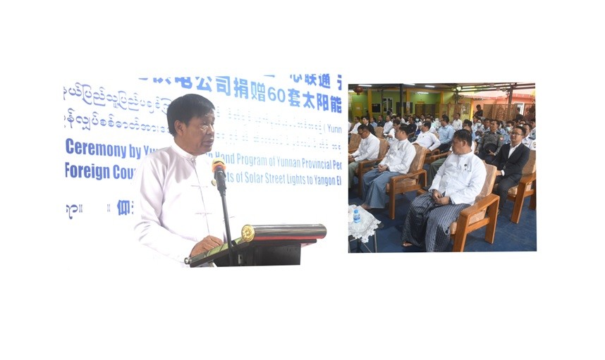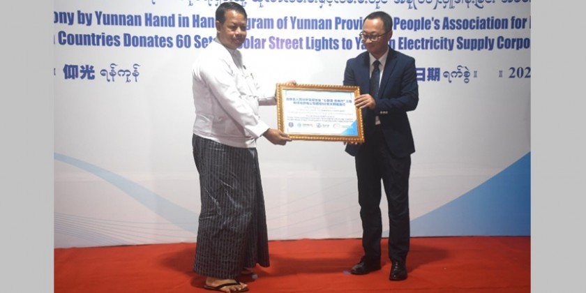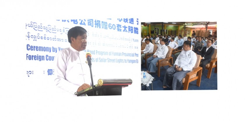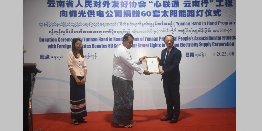 Donation Ceremony of 60 pairs of solar lamp posts to Yangon Electricity Supply Corporation organized by Internal working Platform of Yunnan Association for Friendship with foreign countries (YNP AFFC) through the Yunnan Hand in Hand Program was held at the Myanmar International Education Centre in Thingangyun township on Tuesday.