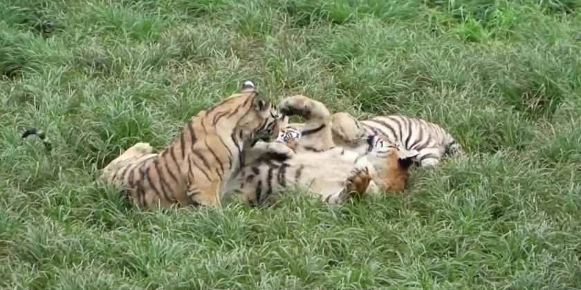 At the event site, staff prepared a beef skeleton for the tiger couple. Meanwhile, five three-month-old cubs made their summer debut for visitors, looking adorable as they chewed beef and gnawed on large bones.