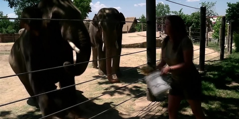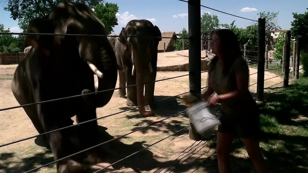 The temperature on Thursday hit a record high of 37.7 Celsius, according to a report from KMGH. Much of the American West has been blasted with sweltering heat this week as a high pressure dome combines with the worst drought in modern history to launch temperatures into the triple digits, toppling records even before the official start of summer. The heat is a challenge for staff taking care of animals at the Denver Zoo. Even as animal care workers start their day at 7am in the morning feeding elephants and other animals, the temperature is already in the 80's, according to a KMGH report.